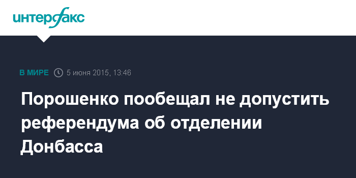 Москва. 5 июня. INTERFAX.RU - Президент Украины Петр Порошенко исключил возможность проведения референдума по вопросу отделения Донбасса во время своего правления.