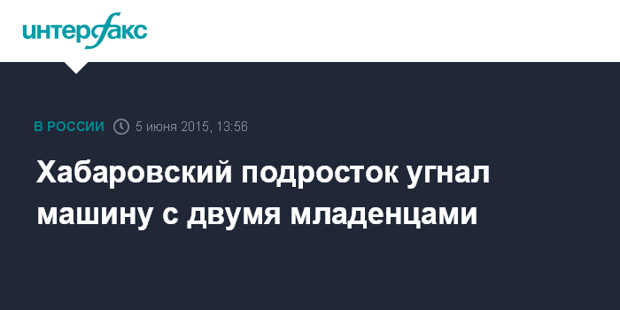 Москва. 5 июня. INTERFAX.RU - Хабаровские полицейские задержали 16-летнего угонщика автомобиля, в котором находились два 10-месячных младенца, сообщила "Интерфаксу" официальный представитель МВД России Елена Алексеева.