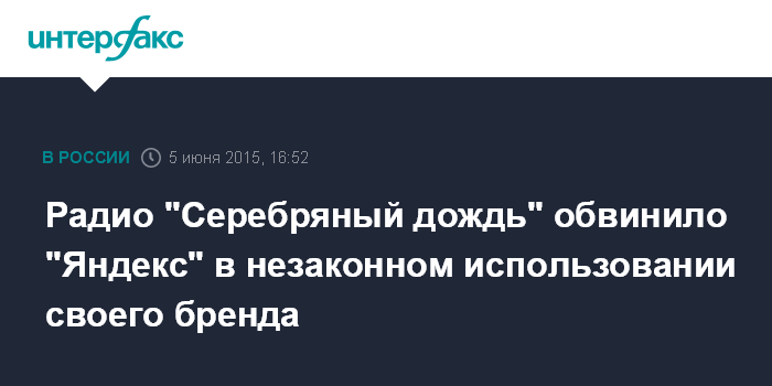"Радиостанция "Серебряный дождь" заявляет, что компания "Яндекс" грубо нарушает закон, используя бренд радиостанции в проекте "Яндекс.Радио". В ближайшее время с нашей стороны будут приняты меры с целью остановить незаконное использование и компенсировать полученные от этого использования потери", - говорится в заявлении радиостанции, поступившем в "Интерфакс" в пятницу.