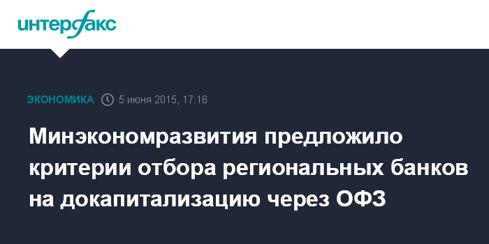 Москва. 5 июня. INTERFAX.RU – Минэкономразвития предложило критерии для включения региональных банков в программу докапитализации с помощью облигаций федерального займа (ОФЗ) и список региональных банков, которые потенциально могли бы ей воспользоваться, сообщил "Интерфаксу" источник в финансово-экономическом блоке правительства.