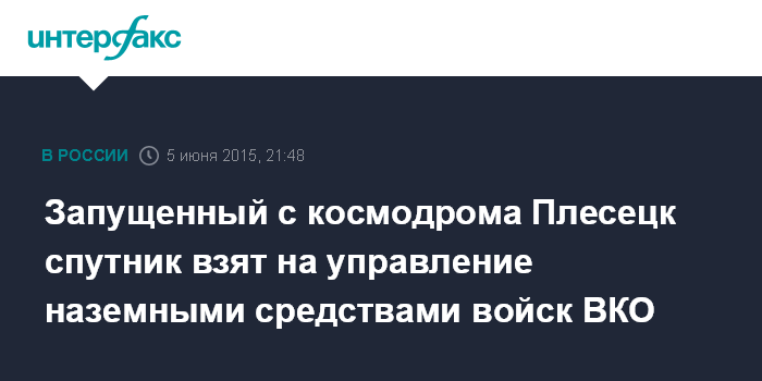 Москва. 5 июня. INTERFAX.RU – Наземные средства Войск Воздушно-космической обороны (ВКО) взяли на управление космический аппарат военного назначения, сообщили "Интерфаксу" в управлении пресс-службы и информации Минобороны РФ.