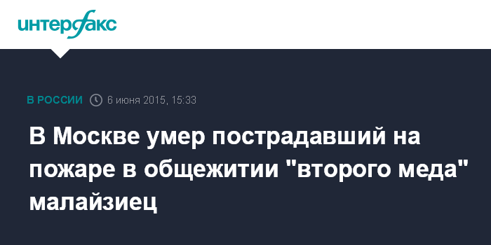 Москва. 6 июня. INTERFAX.RU - В НИИ Склифосовского скончался гражданин Малайзии, пострадавший во время апрельского пожара в общежитии Российского государственного медицинского университета.