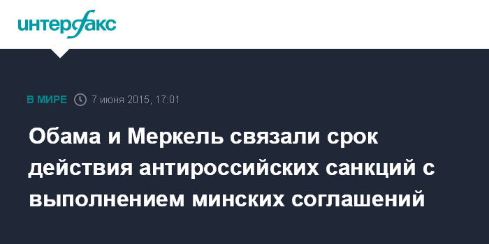 Москва. 7 июня. INTERFAX.RU - Канцлер ФРГ Ангела Меркель и президент США Барак Обама сошлись во мнении относительно продолжения действия санкционного режима в отношении России.