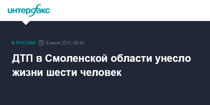 Москва. 8 июня. INTERFAX.RU - Жертвами ДТП в Смоленской области стали шесть человек, сообщается на сайте областного УМВД.