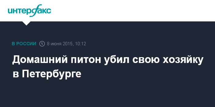 Москва. 8 июня. INTERFAX.RU - Сотрудники полиции обнаружили в одной из квартир северной столицы тело женщины, которая скончалась после смертельного укуса питона, сообщили "Интерфаксу" в пресс-службе ГУ МВД по Санкт-Петербургу и Ленинградской области в понедельник.