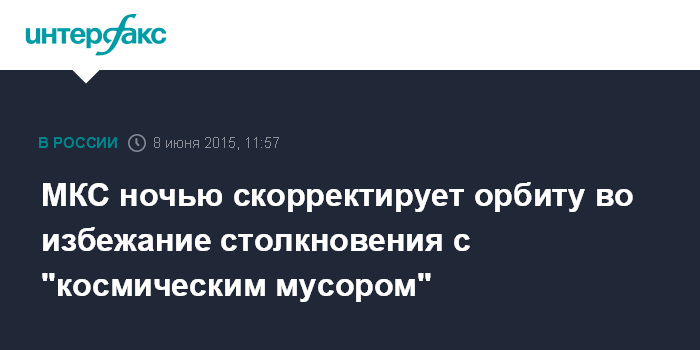 Москва. 8 июня. INTERFAX.RU - Маневр уклонения Международной космической станции от "космического мусора" может быть осуществлен в ночь на вторник, сообщил "Интерфаксу" в понедельник источник в ракетно-космической отрасли.