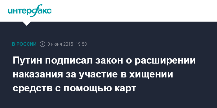 Москва. 8 июня. INTERFAX.RU - Президент РФ Владимир Путин подписал изменения в Уголовный кодекс, расширяющие наказание за участие в хищении средств с помощью банковских карт. Текст соответствующего закона, принятого Госдумой 19 мая и одобренного Советом Федерации 3 июня, размещен на официальном интернет-портале правовой информации.
