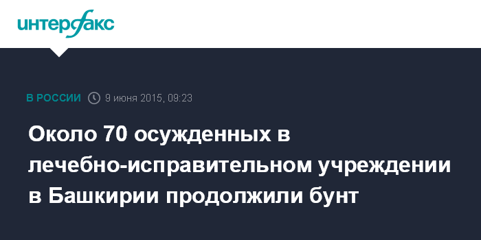 Как сообщалось, 8 июня несколько десятков осужденных, содержащихся в лечебно-исправительном учреждении №19 в городе Салавате, устроили бунт, требуя освободить лидера группы отрицательно настроенных заключенных, находящегося в отряде со строгими условиями содержания. Часть осужденных забаррикадировались в помещениях одного из отрядов, порядка 20 человек забрались на крышу здания отряда.