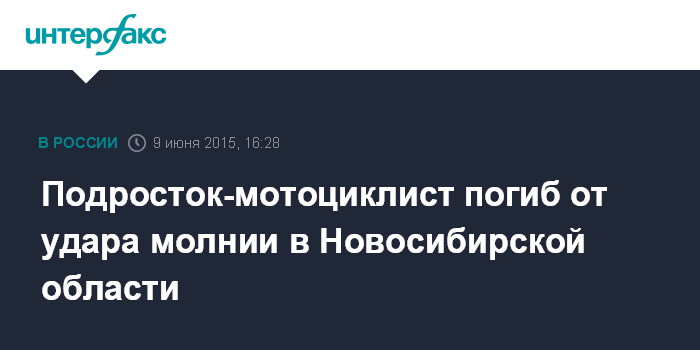 Москва. 9 июня. INTERFAX.RU - 15-летний подросток погиб от удара молнии во время грозы в Новосибирской области во вторник, сообщили "Интерфаксe" в пресс-службе ГУ МВД России по региону.