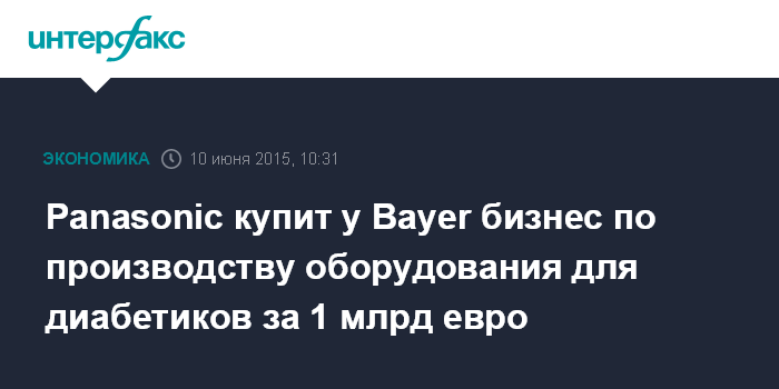 Москва. 10 июня. INTERFAX.RU – Германская компания Bayer достигла соглашения о продаже бизнеса по производству оборудования для больных диабетом японской Panasonic Healthcare за 1 млрд евро, сообщается в совместном заявлении компаний.