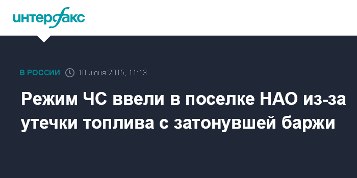 Москва. 10 июня. INTERFAX.RU - Спасатели устраняют последствия разлива топлива с затонувшей в реке Коротаиха (поселок Каратайка, Ненецкий автономный округ, НАО) баржи, в поселке введен режим ЧС, сообщили "Интерфаксу" в региональном управлении МЧС в среду.
