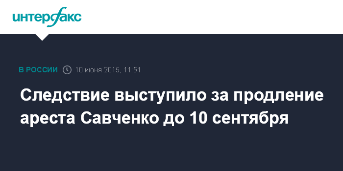 Москва. 10 июня. INTERFAX.RU – Следствие попросило суд продлить содержание под стражей до 10 сентября украинке Надежде Савченко, обвиняемой в РФ в пособничестве убийству российских журналистов.