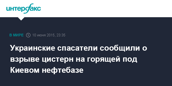 Москва. 10 июня. INTERFAX.RU - В среду вечером на горящей нефтебазе в поселке Глеваха Васильковского района Киевской области произошел взрыв нескольких цистерн, жертв и пострадавших нет, сообщила пресс-служба Госслужбы Украины по чрезвычайным ситуациям.