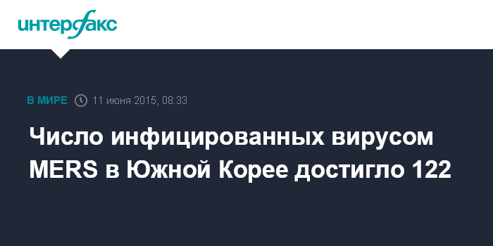 Москва. 11 июня. INTERFAX.RU - Власти Южной Кореи в четверг сообщили о выявлении новых 14 носителей смертоносного коронавируса MERS. Таким образом, по состоянию на утро четверга в Южной Корее официально зарегистрировано 122 инфицированных.