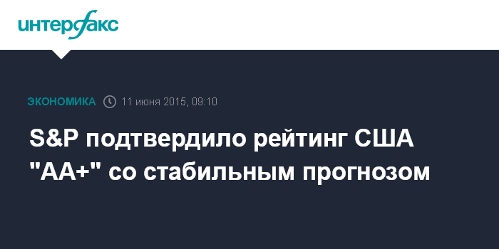 Москва. 11 июня. INTERFAX.RU - Международное рейтинговое агентство Standard & Poor's подтвердило долгосрочный суверенный кредитный рейтинг США на уровне "АА+", краткосрочный - на уровне "А-1+".