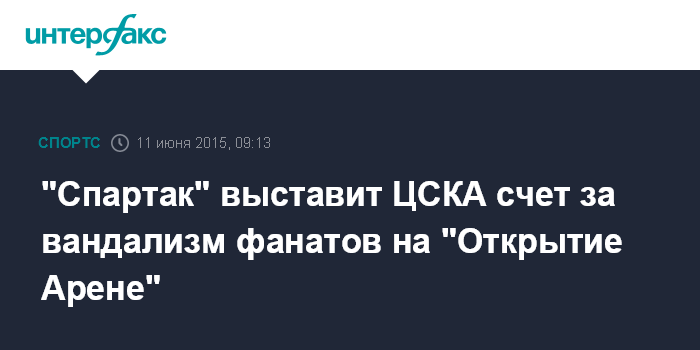 Москва. 11 июня. INTERFAX.RU - Московский "Спартак" планирует взыскать с ЦСКА деньги за порчу имущества на "Открытие Арене" во время матча 28-го тура Российской футбольной премьер-лиги (РФПЛ) сезона-2014/15, сообщают "Известия" со ссылкой на директора стадиона Андрея Федуна.