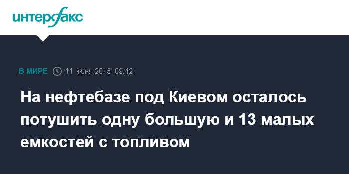 Москва. 11 июня. INTERFAX.RU - На нефтебазе "БРСМ-Нафта" в Васильковском районе Киевской области продолжает гореть одна большая емкость с горючим, сообщили в пресс-службе Госслужбы Украины по чрезвычайным ситуациям (ГСЧС).