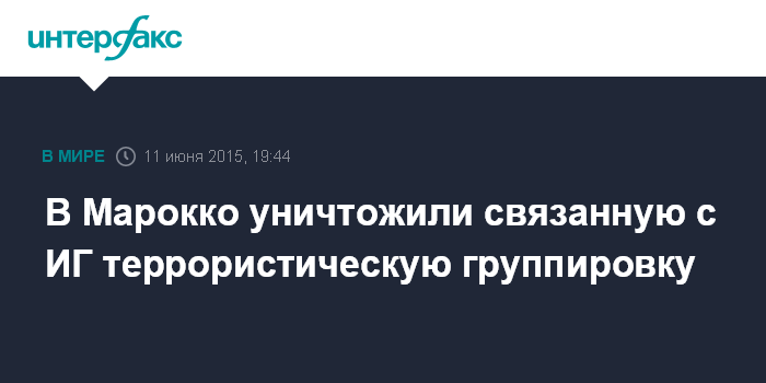 Москва. 11 июня. INTERFAX.RU - В ходе спецоперации в Марокко уничтожена экстремистская группировка, связанная с террористическим "Исламским государством" (ИГ), говорится в заявлении министерства страны, распространенном в четверг.