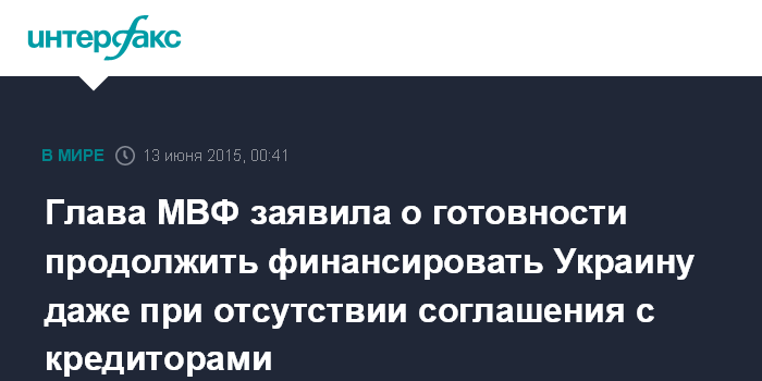 Москва. 13 июня. INTERFAX.RU - МВФ готов продолжать финансировать Украину даже при отсутствии соглашения с кредиторами, заявила глава фонда Кристин Лагард по сообщению пресс-релиза организации.