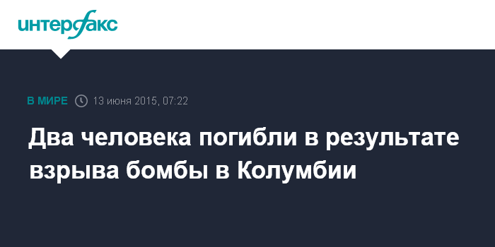 Москва. 13 июня. INTERFAX.RU - В Колумбии в результате взрыва придорожной бомбы в провинции Нарино на границе с Эквадором погибли два человека, в том числе офицер полиции, сообщает BBC.
