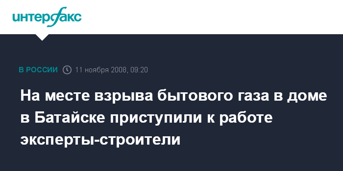 Москва. 11 ноября. INTERFAX.RU - Группа экспертов-строителей приступила к обследованию поврежденного взрывом бытового газа пятиэтажного жилого дома в городе Батайске.