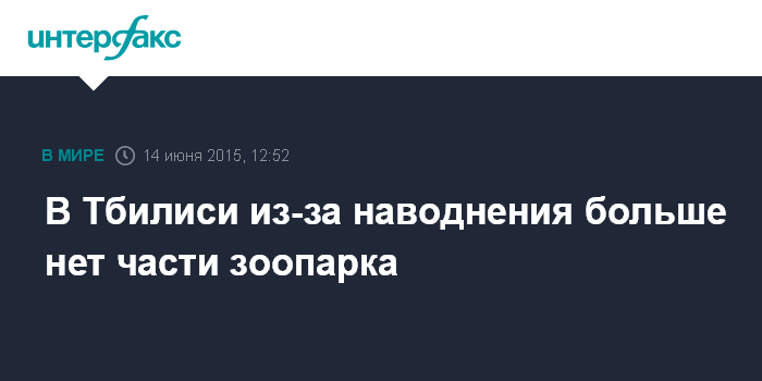 Москва. 14 июня. INTERFAX.RU - В Тбилиси из-за наводнения до сих пор остается затопленной половина территории зоопарка, спасатели на лодках помогают сотрудникам зоосада вытаскивать найденных в воде животных, сообщила руководитель службы по связям с общественностью зоологического парка Мзия Шарашидзе.