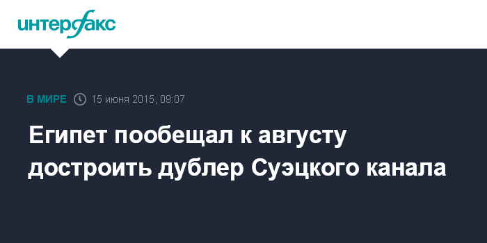 Москва. 15 июня. INTERFAX.RU - Строительство в Египте новой водной магистрали, которая должна расширить мощности Суэцкого канала, планируется завершить в августе этого года, заявляют власти страны.