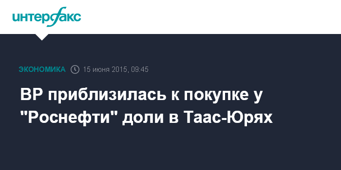 Москва. 15 июня. INTERFAX.RU – Британская нефтяная компания ВР близка к заключению соглашения о покупке у "Роснефти" 20%-ной доли в проекте по разработке сибирского месторождения Таас-Юрях примерно за $700 млн, сообщает The Financial Times со ссылкой на источники.