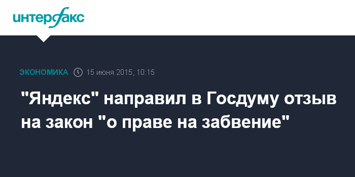 Москва. 15 июня. INTERFAX.RU - "Яндекс" отправил в комитет Госдумы по информполитике отзыв на поправки к закону "Об информации", Гражданскому и Гражданскому процессуальному кодексам - на так называемый закон о "праве на забвение". Об этом сообщает в понедельник "Коммерсант".