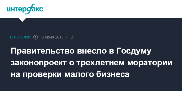 Москва. 15 июня. INTERFAX.RU – Правительство РФ внесло в Госдуму законопроект, устанавливающий запрет на плановые проверки субъектов малого предпринимательства с 1 января 2016 по 31 декабря 2018 года. Текст документа опубликован в электронной базе документов нижней палаты парламента.