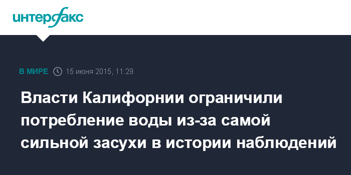 Москва. 15 июня. INTERFAX.RU - Власти штата Калифорния приняли решение резко сократить подачу воды фермерским хозяйствам в связи с продолжающейся четвертый год засухой, передает BBC.