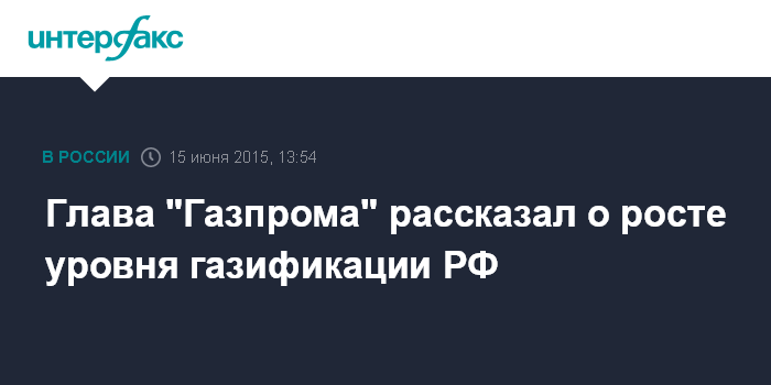 Председатель правления "Газпрома" Алексей Миллер на встрече с президентом РФ Владимиром Путиным сообщил: "В среднем газификация в стране природным газом составляет сейчас 65,4% (65,3% - на конец 2013 года - ИФ). 70,3% - это газификация городов и поселков городского типа (70,9% - ИФ). Что примечательно, газификация на селе - это 54,6% (54% - ИФ)", - сказал Миллер.