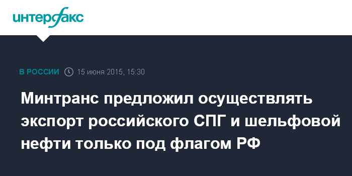 Москва. 15 июня. INTERFAX.RU - Морской экспорт российского сжиженного природного газа (СПГ) и нефти, добытой на шельфе, должен осуществляться только судами под российским флагом. Соответствующие изменения в законопроект "О недрах" предлагает внести Минтранс, заявил "Интерфаксу" высокопоставленный чиновник, знакомый с проектом документа.