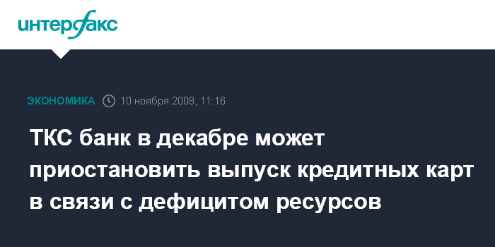 Дубай. 10 ноября. INTERFAX.RU - Банк "Тинькофф. Кредитные системы" (ТКС банк) в декабре может приостановить выпуск новых кредитных карт в связи с ограниченными возможностями по привлечению финансовых ресурсов.
