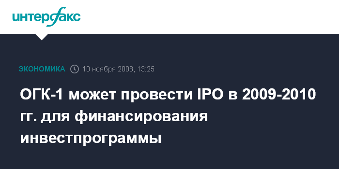 Дубай. 10 ноября. INTERFAX.RU - ОАО "ОГК-1" может провести IPO в 2009-2010 годах для финансирования инвестпрограммы.