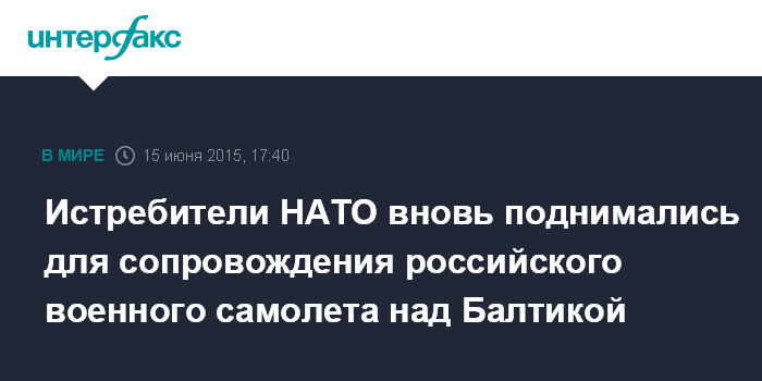 Москва. 15 июня. INTERFAX.RU - Истребители НАТО в понедельник поднимались с базы в литовском Шяуляе в воздух для опознания летевшего над Балтийским морем российского военного разведывательного самолета с выключенным транспондером.