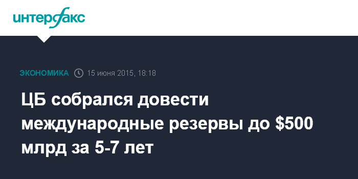 Москва. 15 июня. INTERFAX.RU - ЦБ РФ планирует решить задачу по доведению объема международных резервов до $500 млрд в течение 5-7 лет, говорится в докладе о денежно-кредитной политике, опубликованном Банком России в понедельник.