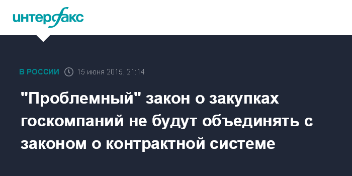 Москва. 15 июня. INTERFAX.RU - Реализация закона о закупках госкомпаниями и монополями (223-й закон) показывает, что его нужно менять, но объединять с законом о контрактной системе (44-й закон о государственных и муниципальных закупках) его не планируется. Об этом заявил директор департамента развития контрактной системы Минэкономразвития РФ Максим Чемерисов.
