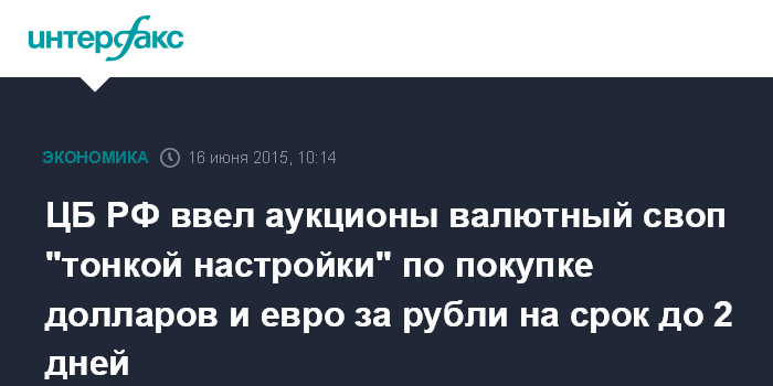 Москва. 16 июня. INTERFAX.RU – Банк России с 16 июня 2015 года дополнил систему инструментов денежно-кредитной политики аукционами валютный своп "тонкой настройки" по покупке долларов и евро за рубли на срок от 1 до 2 дней, говорится в сообщении регулятора.