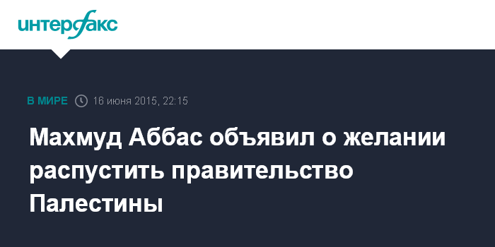 Москва. 16 июня. INTERFAX.RU - Палестинский лидер Махмуд Аббас во вторник объявил о планах в течение ближайших суток распустить палестинское правительство, сообщает сайт израильского издания "Йедиот ахронот" со ссылкой на источник в палестинском руководстве.