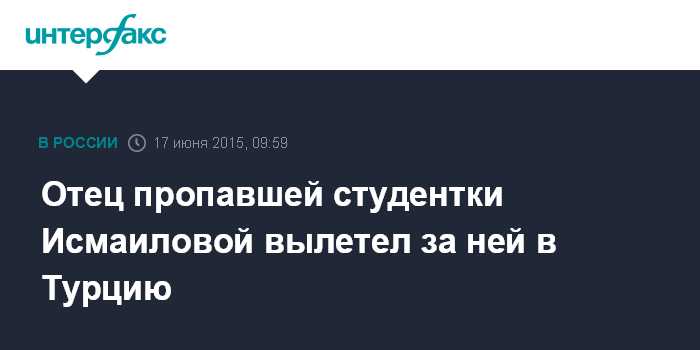 Москва. 17 июня. INTERFAX.RU - Отец студентки Российской академии народного хозяйства и госслужбы при президенте РФ (РАНХиГС) Мариам Исмаиловой, которая исчезла три дня назад, вылетел за дочерью в Турцию, сообщил "Интерфаксу" информированный источник.