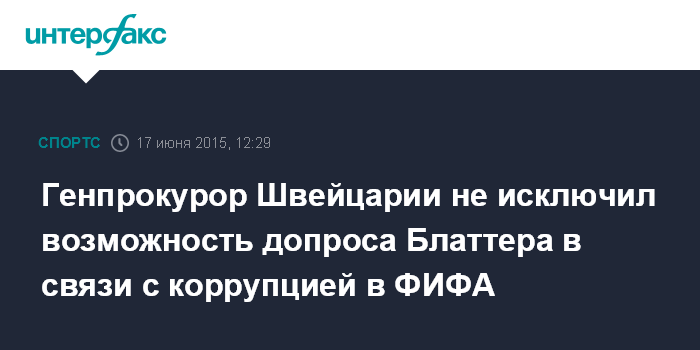 Москва. 17 июня. INTERFAX.RU – Генеральный прокурор Швейцарии Михаэль Лаубер заявил в среду, что не исключает возможность проведения допроса президента ФИФА Йозефа Блаттера и генсека федерации Жерома Вальке в рамках расследования коррупционного скандала, сообщает агентство EFE.