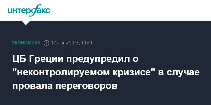 Москва. 17 июня. INTERFAX.RU – Центробанк Греции предупредил, что если страна не сможет достичь соглашения с международными кредиторами о финансовой помощи, ей грозит "неконтролируемый кризис", сообщает агентство Bloomberg.