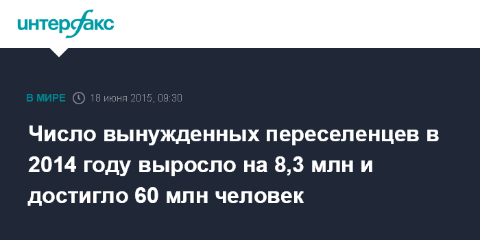 Москва. 18 июня. INTERFAX.RU - Не менее 59,5 млн человек оказались беженцами или внутренне перемещенными лицами в 2014 году, говорится в распространенном в четверг ежегодном докладе Управления Верховного комиссара ООН по делам беженцев (УВКБ ООН).