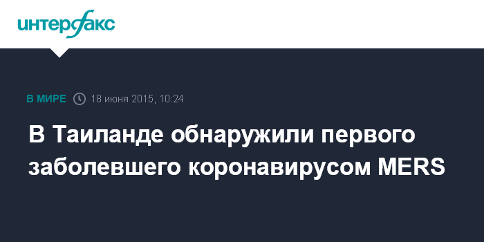 Москва. 18 июня. INTERFAX.RU - В Таиланде зафиксирован первый случай заражения коронавирусом ближневосточного респираторного синдрома (MERS), сообщает агентство EFE со ссылкой на Минздрав Таиланда.