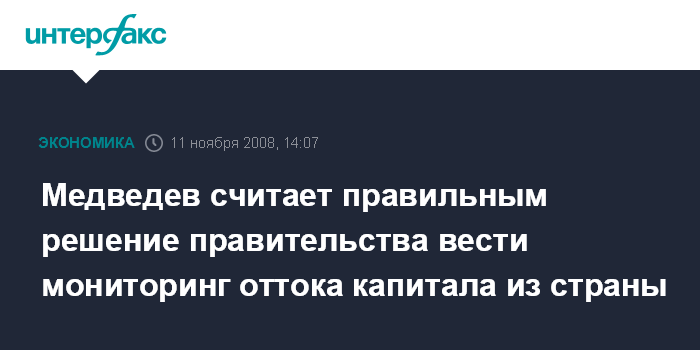 Москва. 11 ноября. INTERFAX.RU - Президент РФ Дмитрий Медведев считает правильным решение правительства вести мониторинг оттока капитала из страны.