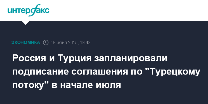 Москва. 18 июня. INTERFAX.RU - Россия и Турция могут подписать соглашение о строительстве первой нитки газопровода "Турецкий поток" в начале июля, сообщил глава Минэнерго Александр Новак в интервью телеканалу "Россия 24".