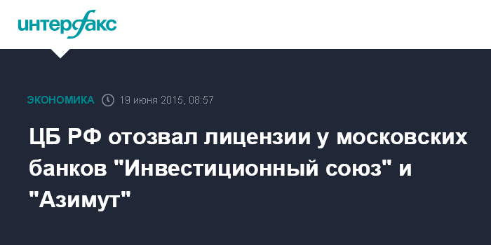 Москва. 19 июня. INTERFAX.RU - Центральный банк России отозвал лицензии на осуществление банковских операций у банков "Инвестиционный союз" (Москва) и "Азимут (Москва), говорится в сообщении Центробанка.