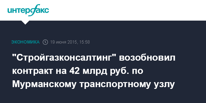 Москва. 19 июня. INTERFAX.RU – "Стройгазконсалтинг", ведущий сейчас судебные тяжбы с Альфа-банком, возобновил исполнение контракта на 42 млрд рублей по Мурманскому транспортному узлу (МТУ), заявил "Интерфаксу" замминистра транспорта Виктор Олерский.