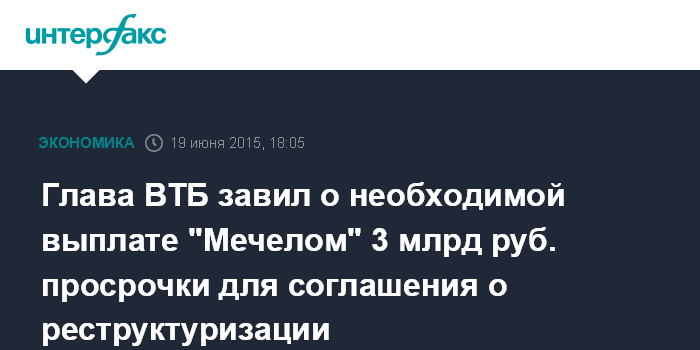 Москва. 19 июня. INTERFAX.RU - "Мечелу" до конца июня надо погасить более 3 млрд рублей просрочки по процентам, чтобы подписать с ВТБ соглашение о реструктуризации долга, сообщил журналистам глава банка Андрей Костин.